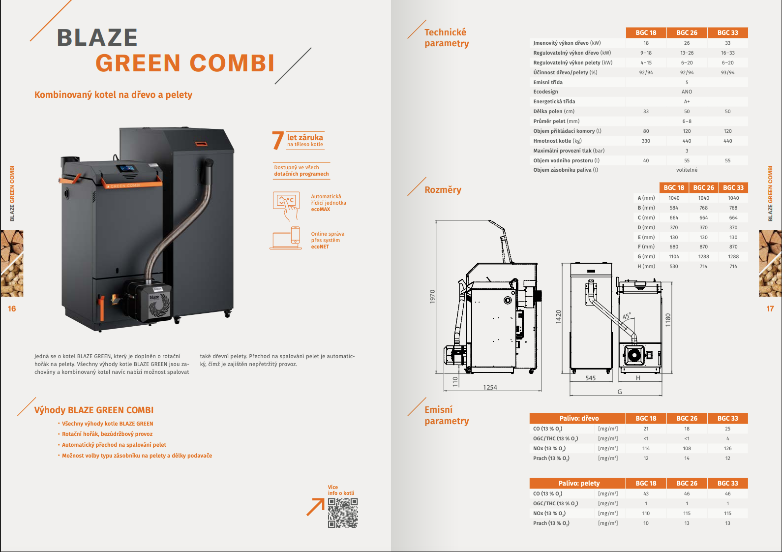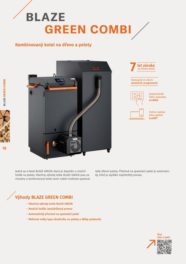 Kotel BLAZE GREEN COMBI představuje nejuniverzálnější řešení na trhu. Umožňuje spalovat dostupné a historicky nejlevnější palivo – dřevo, a zároveň nabízí komfort moderního peletového hořáku. Přechod na spalování pelet je automatický, čímž je zajištěn nepřetržitý provoz. Výhodou je rotační hořák, bezúdržbový provoz a možnost volby typu zásobníku na pelety a délky podavače podle konkrétních prostorových a provozních požadavků.