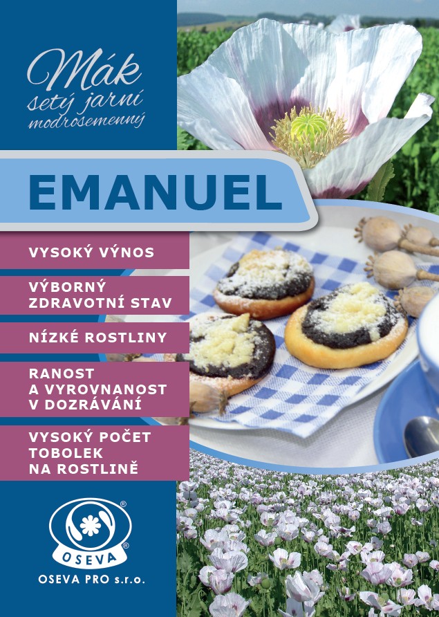 Nově registrovaná právně chráněná odrůda jarního modrosemenného máku EMANUEL (OP-P-20) byla vyšlechtěna ve Výzkumném ústavu olejnin Opava, který spadá pod organizaci OSEVA vývoj a výzkum s.r.o. Registrována byla v roce 2024 po tříletém testování v rámci registračního řízení ÚKZÚZ. Užitná hodnota je dána vysokým výnosem semen (průměr reg. pokusů 1,59 t/ha = 107 % průměru kontrolních odrůd), a proto je odrůda ve srovnání s registrovanými odrůdami máku setého jarního zřejmým přínosem. Detailní charakteristika viz příloha „Rozhodnutí o registraci“. Množitelské porosty pro výrobu osiva byly založeny v roce 2024.