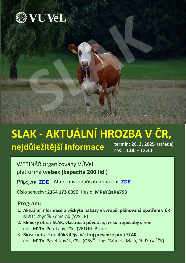 V reakci na objevení se Slintavky a kulhavky v Maďarsku a na Slovensku uspořádal VÚVeL v březnu 2025 odborný webinář věnovaný tomuto onemocnění, které patří mezi nejzávažnější epizootologické hrozby pro chov hospodářských zvířat v České republice i celé Evropě. Zájem o webinář výrazně přesáhl očekávání – kapacita 200 přihlášek byla naplněna během krátké doby. V reakci na vysoký zájem byl webinář také zpřístupněn prostřednictvím záznamu na YouTube kanálu ústavu, kde dosáhl více než 1 600 zhlédnutí. Informace o konání akce a dostupnosti studijních materiálů byly navíc na sociálních sítích ústavu zobrazeny více než 44 000krát, což dokládá výrazný dosah a praktický význam této odborné aktivity. Cílem webináře bylo vzdělávat a zvýšit povědomí odborné veřejnosti o diagnostice, připravenosti a kontrolních opatřeních, které by byly klíčové v případě výskytu SLAK na území ČR.