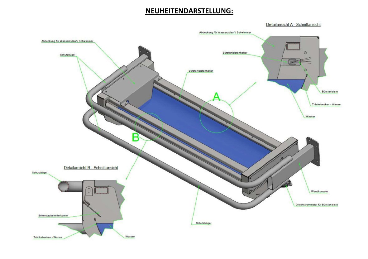 V nastavitelných časových intervalech, například každé dvě hodiny, se pak automaticky provádí čištění kartáčem. Tažení kartáče podél dna žlabu, přičemž nežádoucí zbytky krmiva a jiné nečistoty nebo cizí tělesa, usazené na dně žlabu, jsou vyzdviženy nahoru a pomocí kartáčového čisticího hřebene jsou vytaženy ven, aniž by bylo nutné vypustit napájecí vanu. Tímto procesem má skot neustále k dispozici čistou vodu s odpovídající kvalitou!