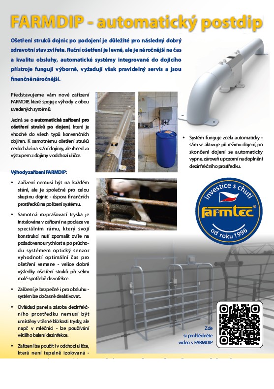 Popis funkce nebo výrobku a způsobu jeho využití. – FARMDIP je samočinné zařízení určené pro automatické ošetření struků po ukončení procesu dojení, je vhodné do všech typů konvenčních dojíren. K aplikaci přípravku nedochází na stání dojírny, ale ihned za výstupem z dojírny v odchozí uličce. Ošetření struků dojnic po podojení je důležité pro následný dobrý zdravotní stav zvířete.